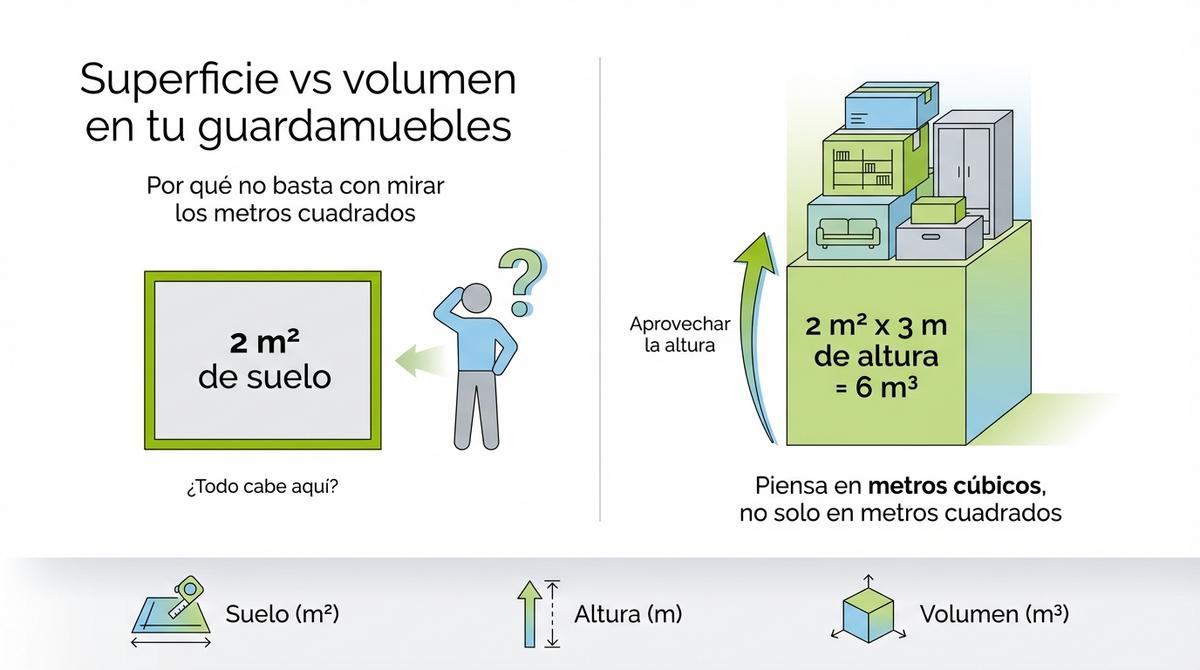 Diferencias clave entre superficie y volumen en un guardamuebles